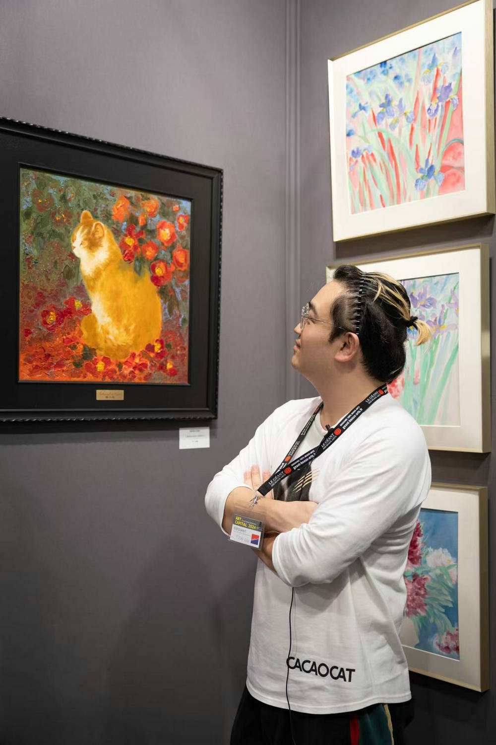 此次巴黎个展集中展出了楼峰近年的代表作品。展出的画作涵盖“猫系列”、鸢尾花主题以及多幅融合油画、中国水墨与水彩的作品,既延续了东方绘画的诗性意境,又融入了西方绘画的表现张力。