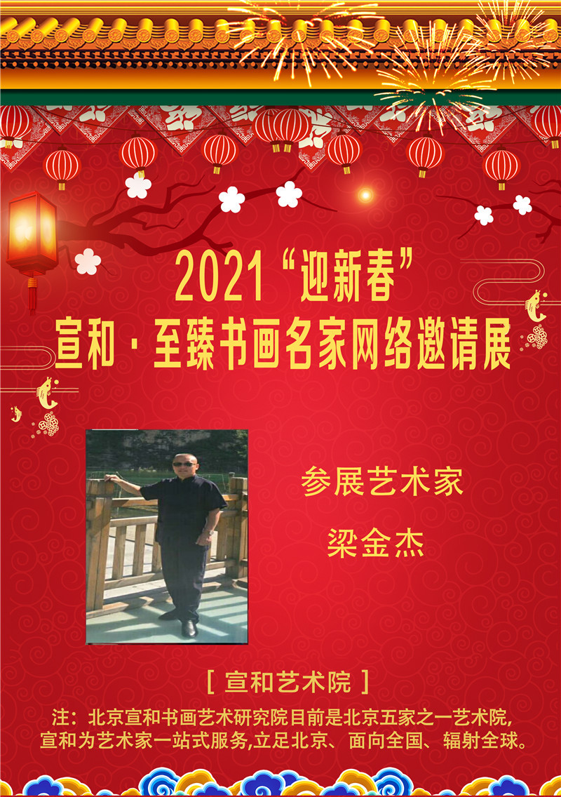 梁金杰,号墨龍,泰宁道人。一九六四年生,祖籍天下第一州涿州市。幼受庭训,与晝畵结缘,痴迷其中。师承王雪涛再传弟子著名书画家孟祥巨先生!研習古今名帖持之以恒,筆耕不辍,主张实力,不慕虚名。作品多次参加各种展览,得到书画界人士好评!作品多次被海内外人士收藏,被誉为接地氣的草根晝法家!被推选为2016年最具影响力書法家!现为中国道教协会道家书画院委员,中国道教协会泰宁宫书画院院长,中国华港书画文化研究院秘书长,河北书协会员,涿州市书画院院士,中掼书画院理事。苏富比文化艺术发展中心艺术总监。中国东方艺术天地会员,书画自然网理事!香港职业书画家协会河北分会副会长兼泰宁宫创作基地主任!今网书画院会员!全球资源网书画顾问团成员!保定刘关张三义文化研究会会员!河北省阜平县道教协会道家书画院顾问!