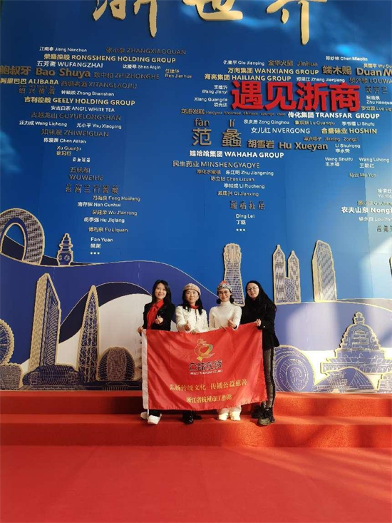 公益在线杭州站小组成员在大堂浙商世界打卡点合影留念